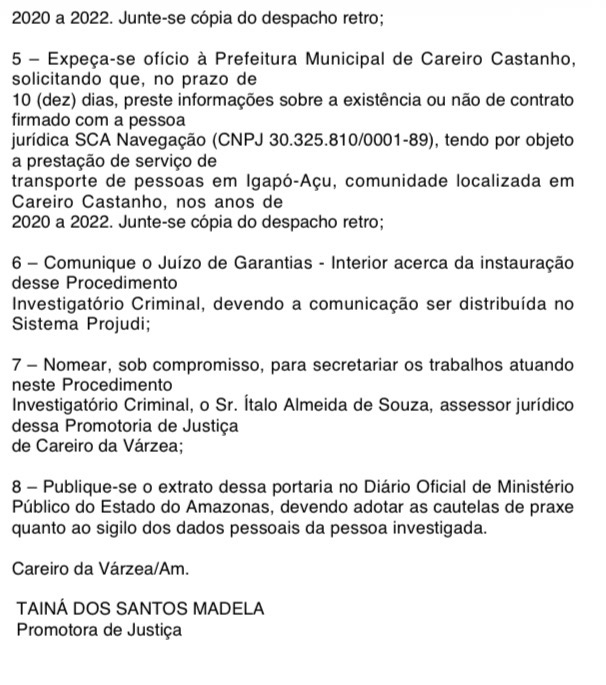 Além disso, as prefeituras de Careiro da Várzea e Careiro Castanho deverão informar se houve contratação da empresa para prestação de serviços de transporte de pessoas na comunidade de Igapó-Açu entre os anos de 2020 e 2022.