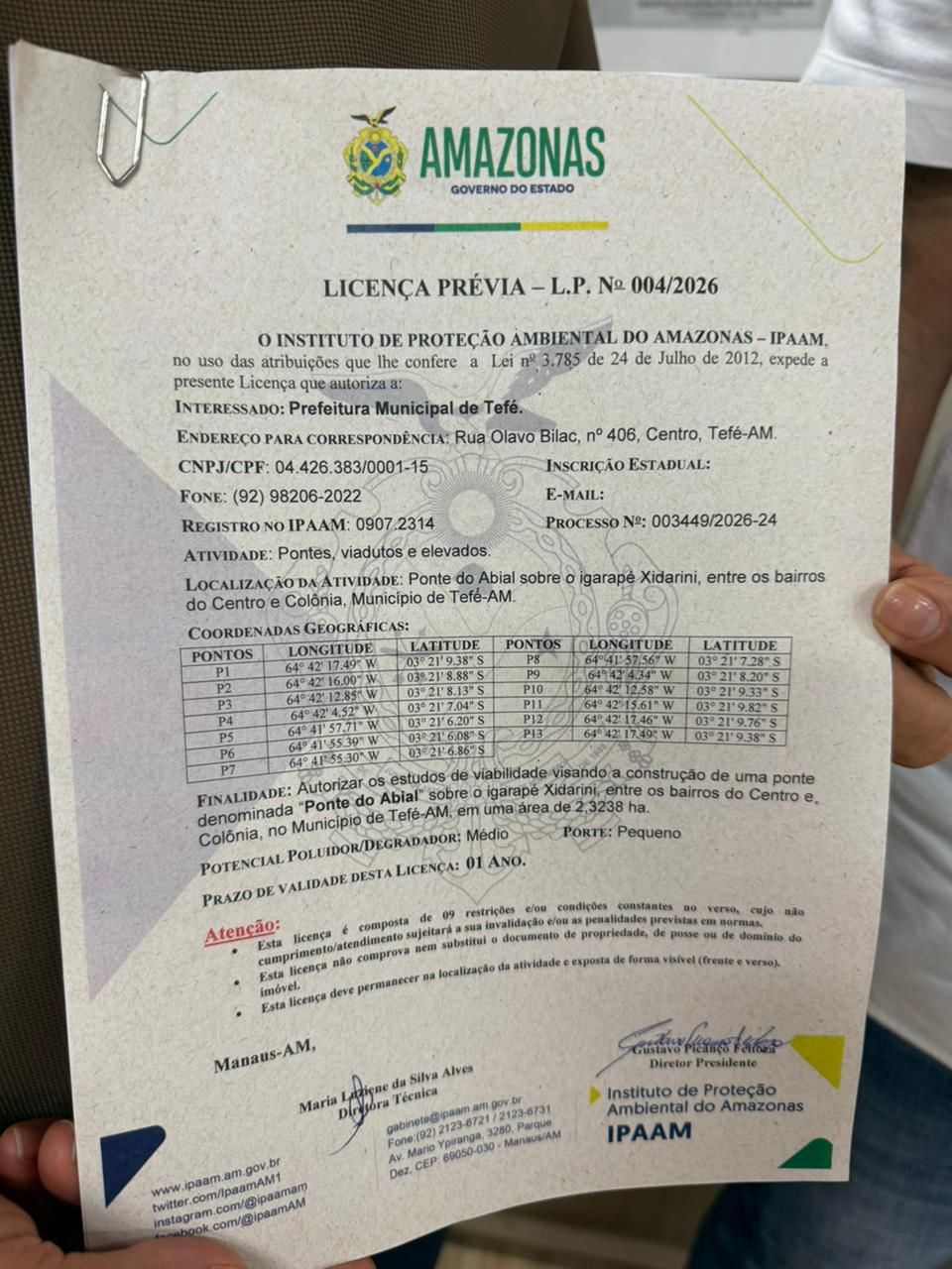 A Prefeitura de Tefé alcançou um marco importante para o desenvolvimento da infraestrutura urbana e a melhoria da mobilidade na cidade. Foi emitida pelo Instituto de Proteção Ambiental do Amazonas (IPAAM) a Licença Prévia nº 004/2026 para a construção da Ponte do Abial, que ligará áreas estratégicas do município de Tefé.