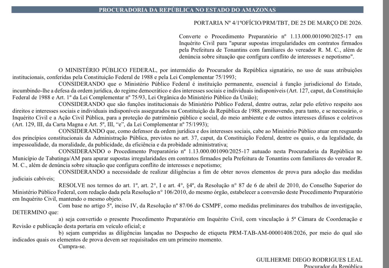 O Ministério Público Federal (MPF) instaurou um inquérito civil para investigar possíveis irregularidades em contratos firmados pela Prefeitura de Tonantins com familiares do vereador Rubervam Castelo(PSD). A medida foi assinada pelo procurador da República, Guilherme Diego Rodrigues Leal, e publicada no Diário Eletrônico do MPF.