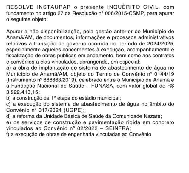 Outro ponto investigado pelo Ministério Público, por meio de inquérito, são possíveis irregularidades relacionadas à transição de governo no município de Anamã, ocorrida entre os anos de 2024 e 2025.