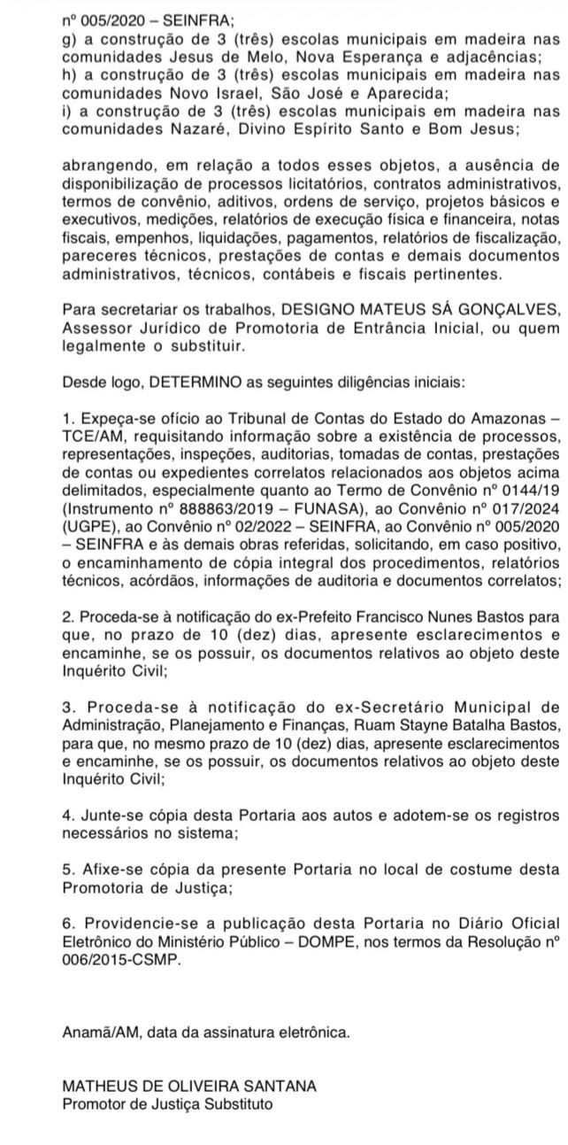 Entre os casos citados na investigação estão obras públicas e convênios firmados pelo município, como a implantação do sistema de abastecimento de água na sede de Anamã, vinculada a convênio com a Fundação Nacional de Saúde (Funasa), no valor de R$ 3,9 milhões, além da construção da primeira etapa do estádio municipal, reformas em unidades de saúde, obras de pavimentação e a construção de escolas municipais em comunidades da zona rural. Também foram mencionadas obras vinculadas a convênios com a Unidade Gestora de Projetos Especiais (UGPE) e com a Secretaria de Estado de Infraestrutura (Seinfra).