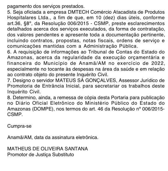 O Ministério Público também solicitou informações ao Tribunal de Contas do Estado do Amazonas (TCE-AM) sobre a regularidade da execução orçamentária e financeira do município de Anamã no exercício de 2022, especialmente no que se refere às despesas na área da saúde e ao contrato objeto da investigação.