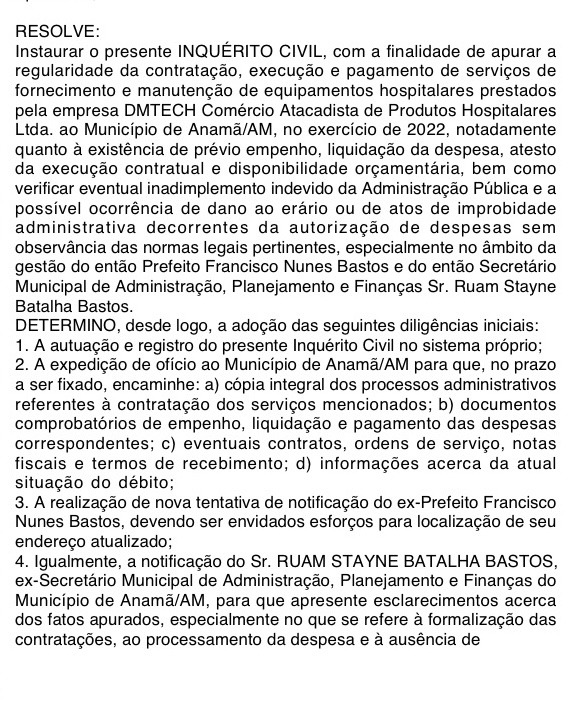 A investigação tem origem em uma Notícia de Fato, que apontou possíveis problemas relacionados à contratação da empresa DMTECH Comércio Atacadista de Produtos Hospitalares Ltda. pela Prefeitura de Anamã.