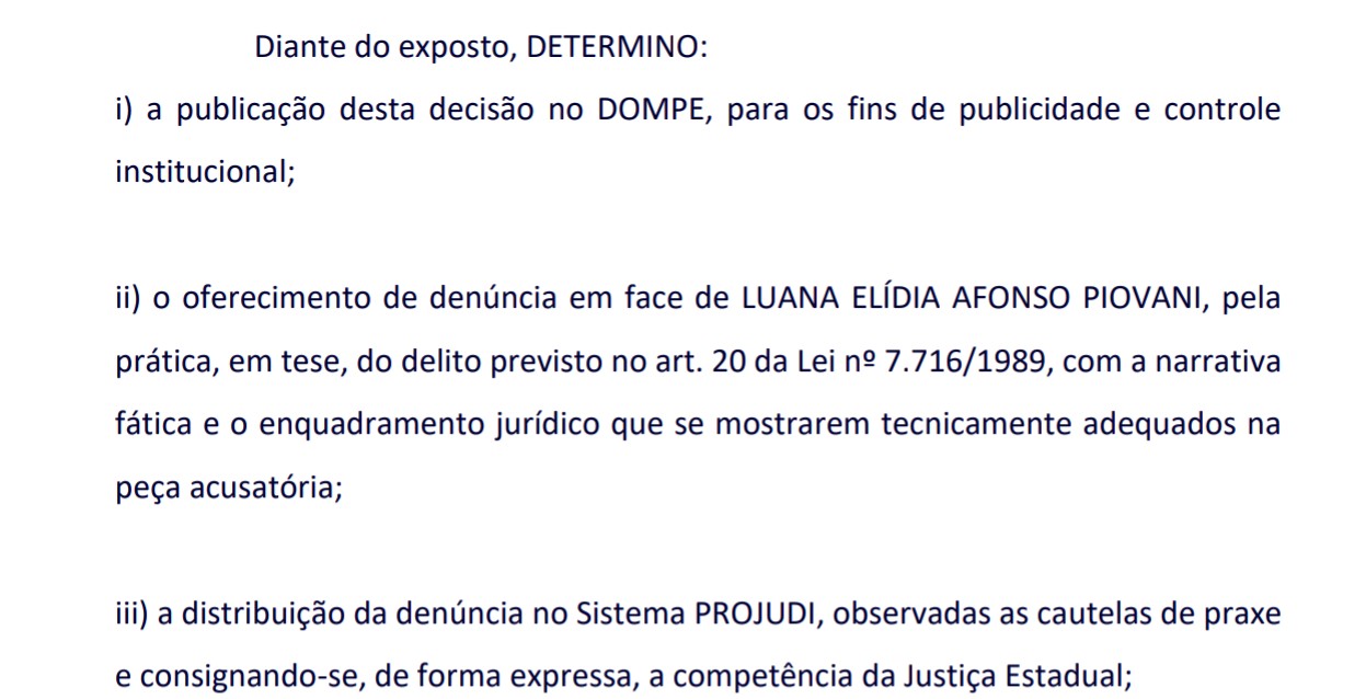 Diante do episódio, o MPAM ofereceu denúncia contra Luana Piovani e determinou a distribuição do processo no sistema Projudi, atribuindo a competência à Justiça Estadual. Segundo o promotor, o fato tem como alvo os evangélicos brasileiros, sem demonstração de caráter transnacional.