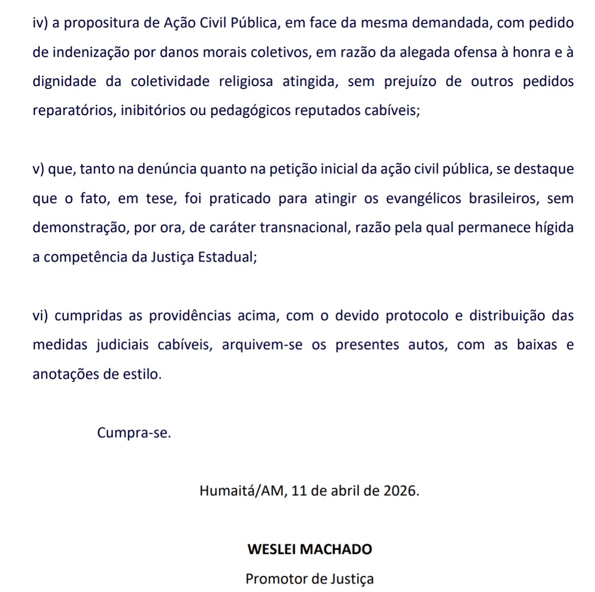 O MP também destacou que, embora o Estado Democrático de Direito garanta a liberdade de expressão, esse direito não autoriza a humilhação coletiva de um grupo religioso nem a naturalização de sua estigmatização pública sob o rótulo de mera franqueza, irreverência ou opinião pessoal