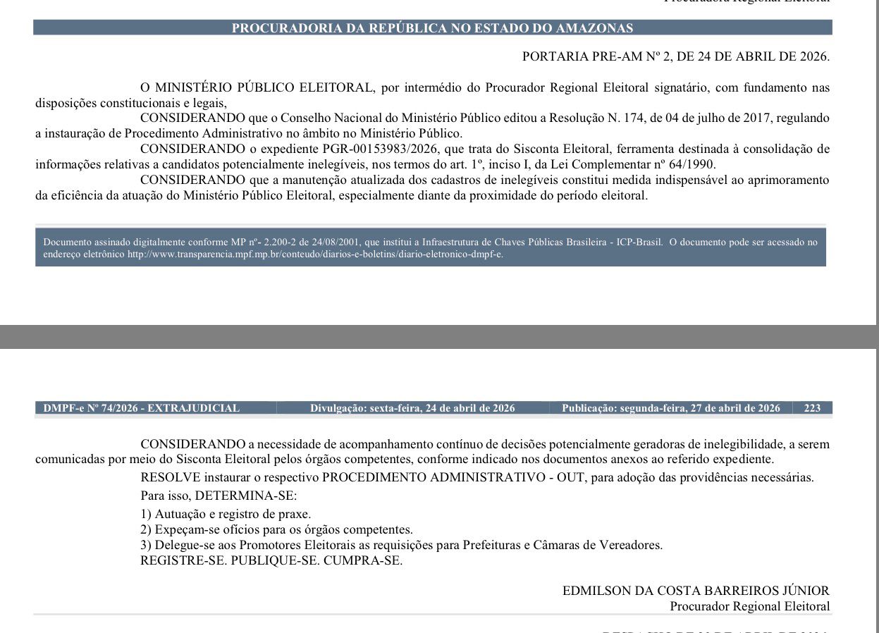 Candidatos a cargos nas eleições de 2026 que possam estar em situação de inelegibilidade serão monitorados de forma contínua pelo Ministério Público Eleitoral (MPE). A Portaria nº 24/2026, instaurada no dia 24 de abril, foi publicada no Diário Eletrônico desta segunda-feira, 27.