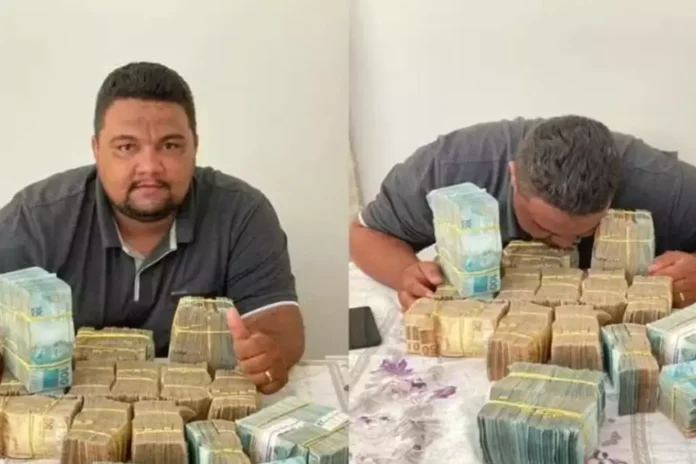 Na imagem publicada, Wallysson Fernandes Lima Cabral, mais conhecido como “Zoi Fernandes”, aparece beijando notas de R$ 50 e R$ 100.
